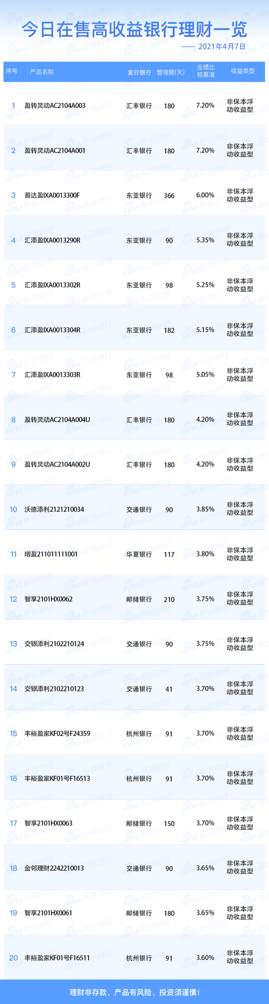 4月7日在售高收益银行理财产品:今日业绩比较基准在6%以上的银行人民币理财产品共3款。汇丰银行“盈转灵动AC2104A003”业绩比较基准最高,为7.20%。