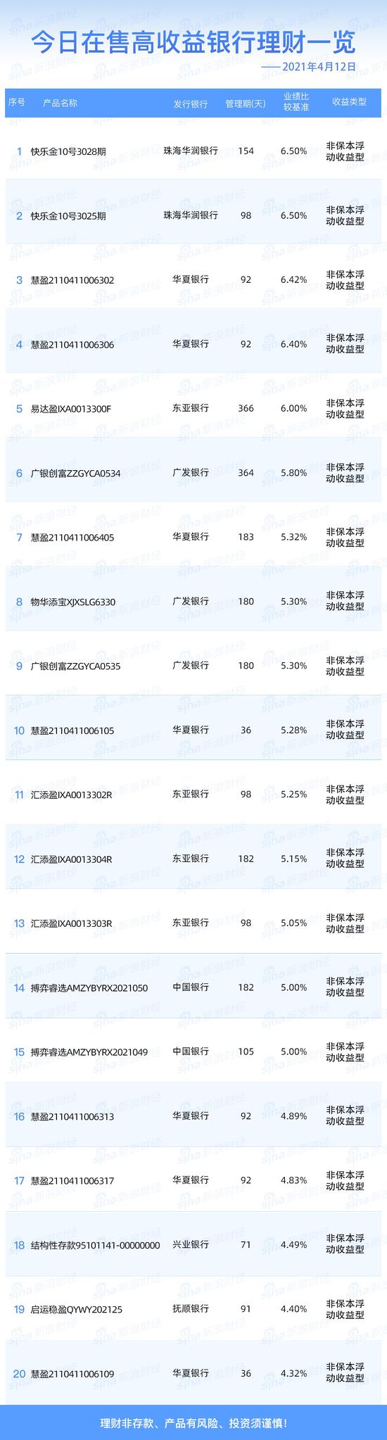 4月12日在售高收益银行理财产品:今日业绩比较基准在6%以上的银行人民币理财产品共5款。珠海华润银行的“快乐金10号3028期”业绩比较基准最高,为6.50%。