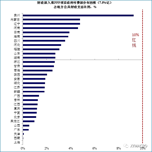 另一个值得关注的问题是,地方政府的财力约束何时达到?根据财政部出台的《政府和社会资本合作项目财政承受能力论证指引》,每年政府PPP项目支出责任占一般公共预算支出比例应当不超过10%。当前PPP项目的投资回报率中值在7.5%左右。从一个非常乐观的假设出发(即认为政府只需要偿付每年7.5%的项目回报率,无需支付投资建设等固定费用),我们发现虽然全国平均来看仍有空间,但部分省市(如贵州)的已入库(非落地)PPP项目规模带来的支付责任已经接近10%财政支出的红线。