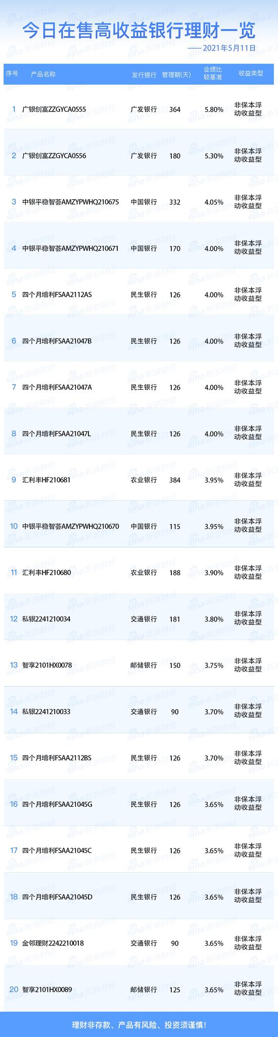 5月11日在售高收益银行理财产品:今日业绩比较基准在4%以上的银行人民币理财产品共8款。广发银行“广银创富ZZGYCA0555”业绩比较基准最高,为5.8%。