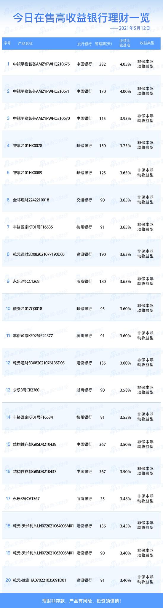 5月12日在售高收益银行理财产品:今日业绩比较基准在3.65%以上的银行人民币理财产品共8款。中国银行(3.280, 0.01, 0.31%)“中银平稳智荟AMZYPWHQ210675”业绩比较基准最高,为4.05%。