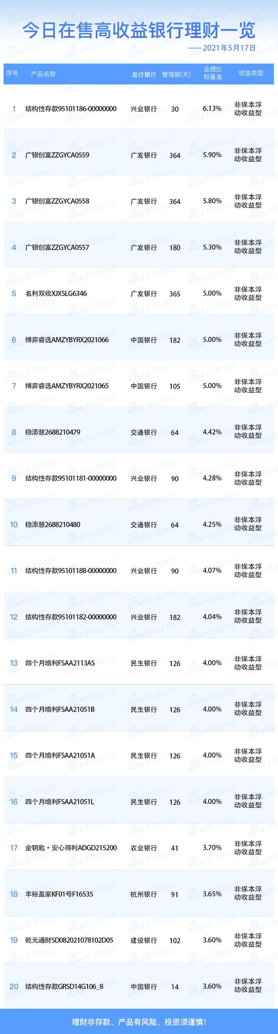 5月14日在售高收益银行理财产品:今日业绩比较基准在5%以上的银行人民币理财产品共7款。兴业银行(23.290, 0.32, 1.39%)“结构性存款95101186-00000000”业绩比较基准最高,为6.13%。