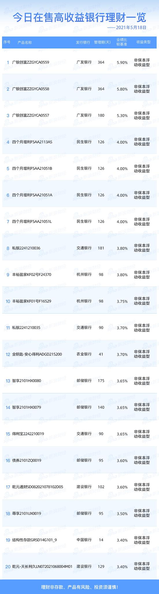 5月18日在售高收益银行理财产品:今日业绩比较基准在4%以上的银行人民币理财产品共7款。广发银行“广银创富ZZGYCA0559”业绩比较基准最高,为5.9%。