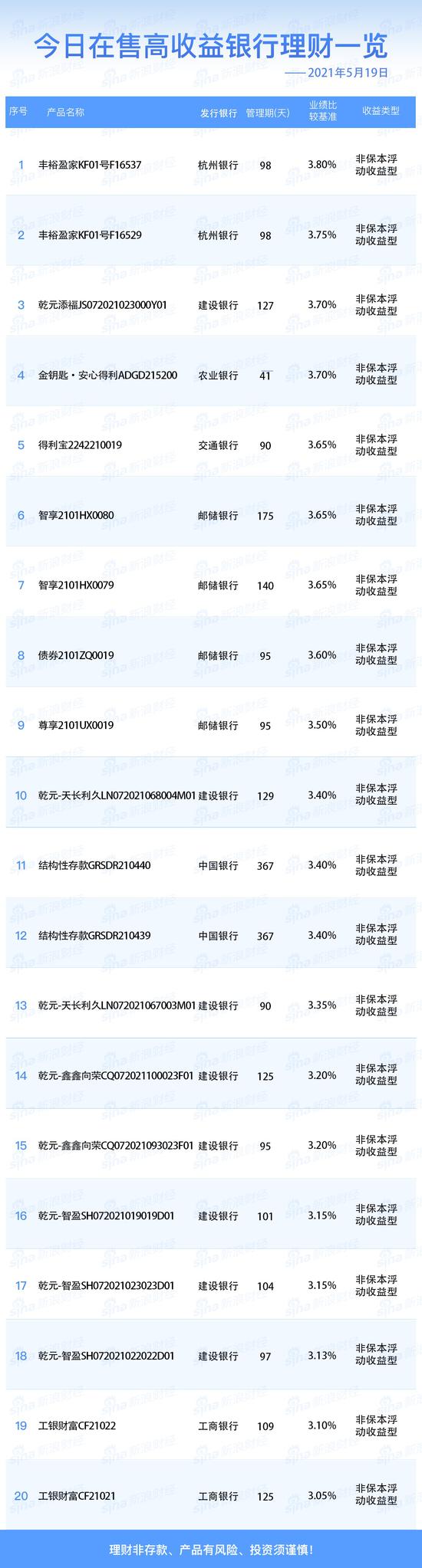 5月19日在售高收益银行理财产品:今日业绩比较基准在3.7%以上的银行人民币理财产品共4款。杭州银行(16.370, -0.10, -0.61%)“丰裕盈家KF01号F16537”业绩比较基准最高,为3.80%。
