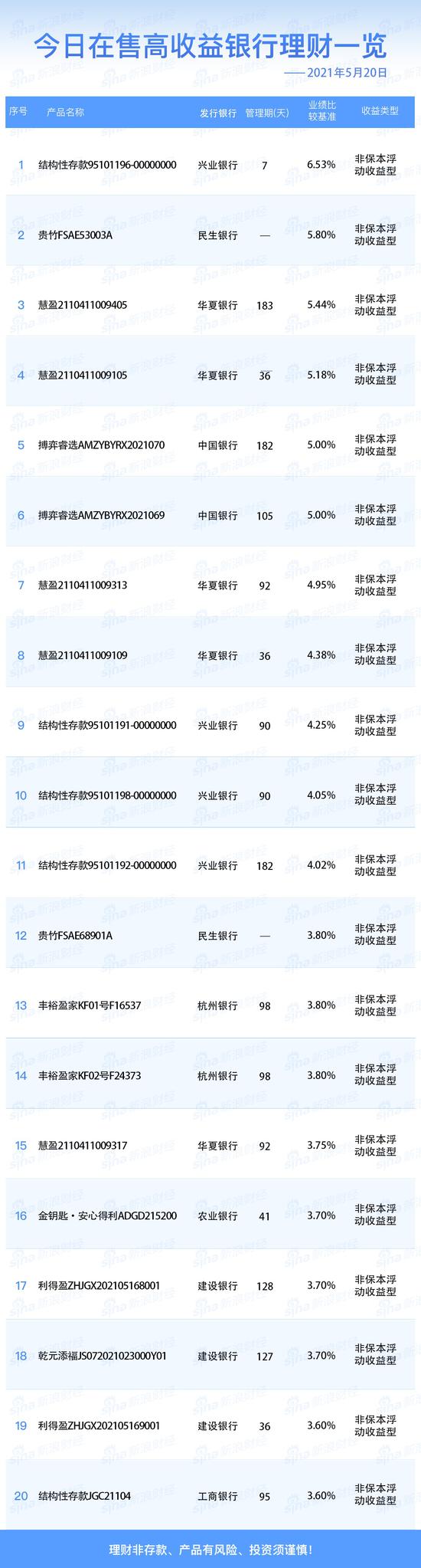 5月20日在售高收益银行理财产品:今日业绩比较基准在5%以上的银行人民币理财产品共6款。兴业银行(21.290, -0.27, -1.25%)“结构性存款95101196-00000000”业绩比较基准最高,为6.53%。