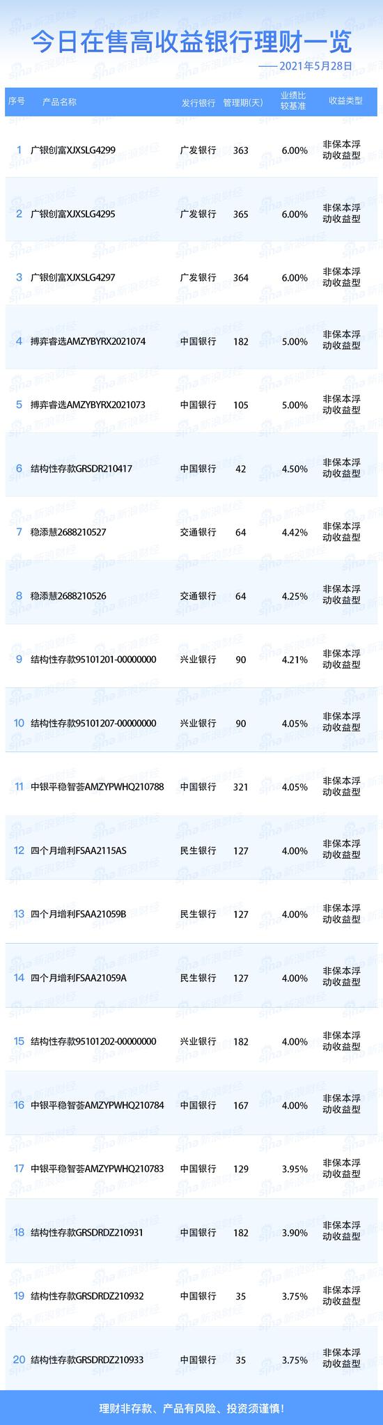 5月28日在售高收益银行理财产品:今日业绩比较基准在5%以上的银行人民币理财产品共5款。广发银行的“广银创富XJXSLG4299”业绩比较基准最高,为6%。