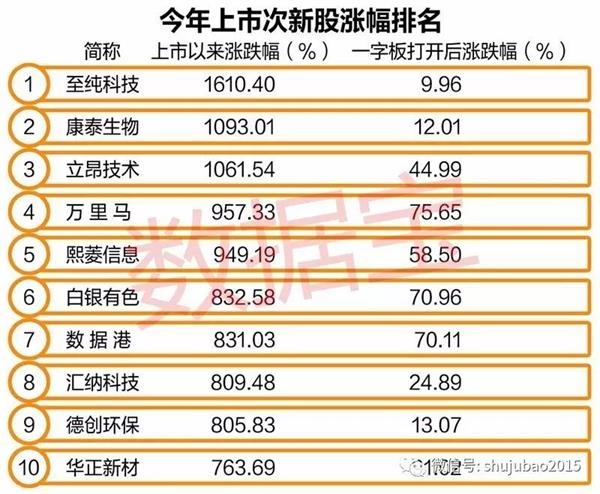 资金的疯狂从另一面凸显了次新股的暴利。数据宝统计显示,今年上市的次新股中,至纯科技、康泰生物、立昂技术等个股最新价较发行价涨超10倍,万里马、熙菱信息、白银有色等24只个股较发行价涨超5倍。一级市场中签者无疑是这场盛宴的最大受益者。中1签吉比特的投资者,若持有到现在每签将赚29万元,富瀚微将赚超11万元;荣泰健康、泛微网络、集友股份等10只新股中签者将赚超5万元。
