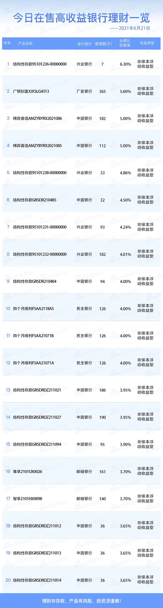 6月21日在售高收益银行理财产品