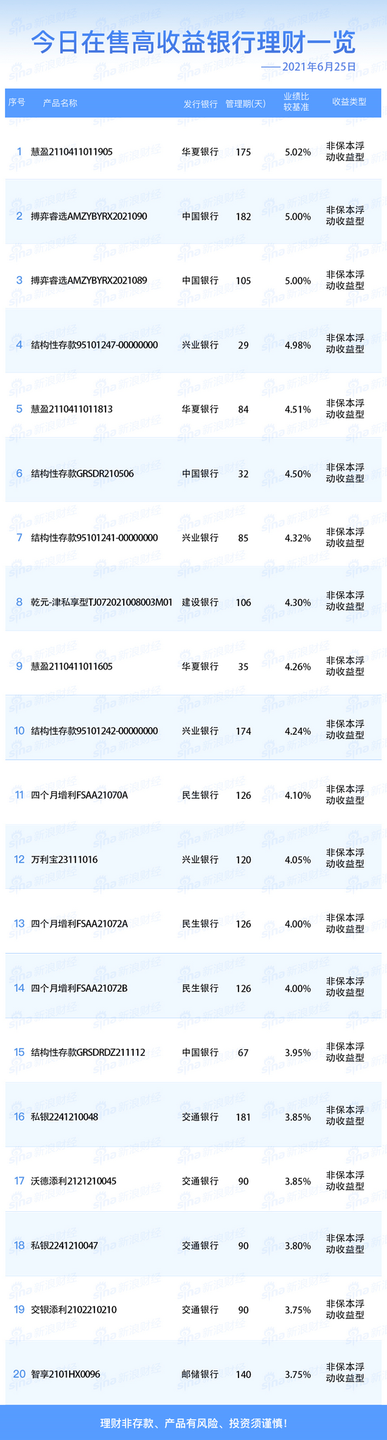 6月25日在售高收益银行理财产品:今日业绩比较基准在4.5%以上的银行人民币理财产品共6款。华夏银行(6.250, 0.01, 0.16%)的“慧盈2110411011905”业绩比较基准最高,为5.02%。