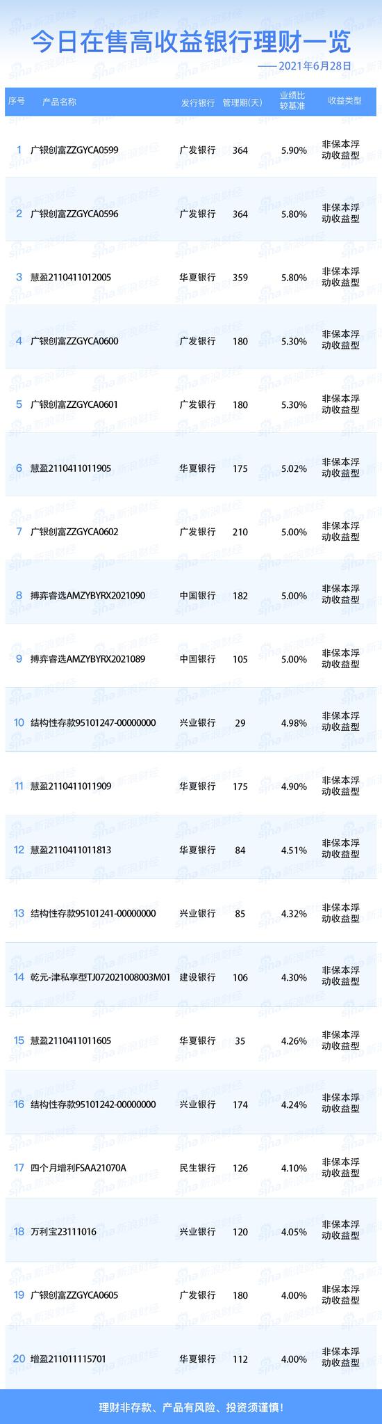 6月28日在售高收益银行理财产品:今日业绩比较基准在5%以上的银行人民币理财产品共9款。广发银行的“广银创富ZZGYCA0599”业绩比较基准最高,为5.02%。