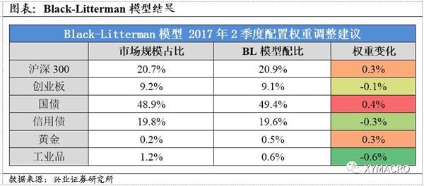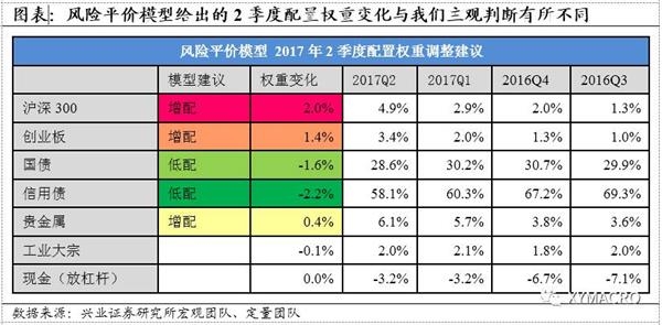 从客观角度出发的风险平价模型对2017年2季度的配置建议是降低债券(尤其是信用债)的配置,增加股票(尤其是大盘股)和贵金属的配置。
