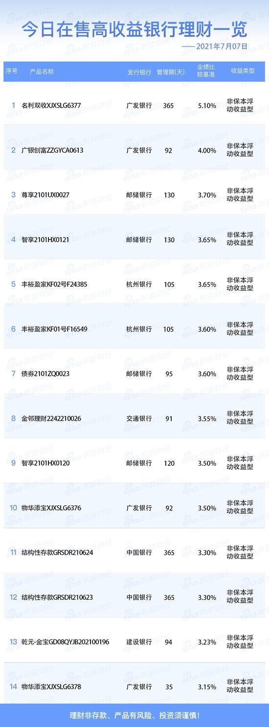 7月7日在售高收益银行理财产品:今日业绩比较基准在4%以上的银行人民币理财产品共2款。广发银行的“名利双收XJXSLG6377”业绩比较基准最高,为5.1%。