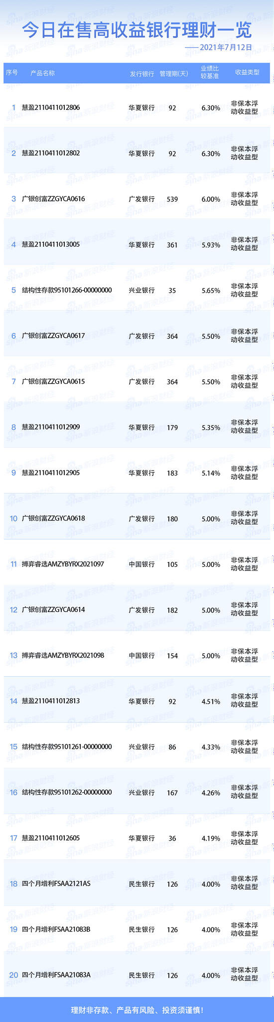 7月12日在售高收益银行理财产品:今日业绩比较基准在6.00%以上的银行人民币理财产品共3款。华夏银行(5.840, 0.02, 0.34%)的“慧盈2110411012806”、“慧盈2110411012802”业绩比较基准最高,为6.30%。