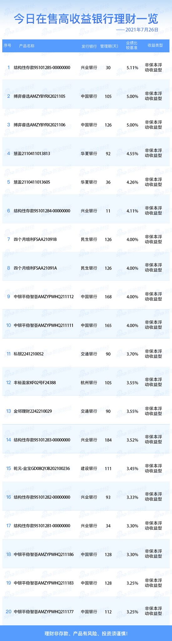 7月26日在售高收益银行理财产品:今日业绩比较基准在4.00%以上的银行人民币理财产品共10款。兴业银行(19.030, -0.76, -3.84%)的“结构性存款95101285-00000000”业绩比较基准最高,为5.11%。