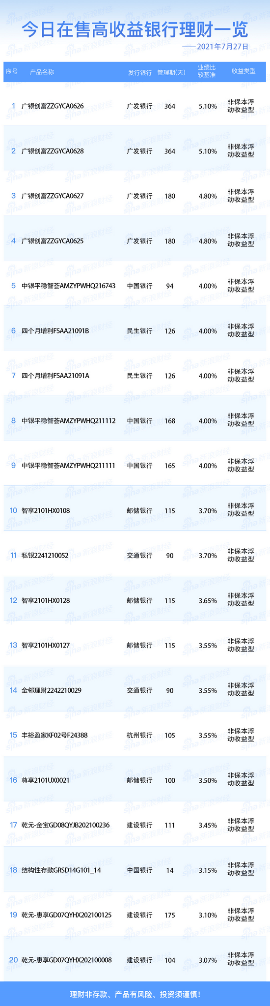 7月27日在售高收益银行理财产品:今日业绩比较基准在4.00%以上的银行人民币理财产品共9款。广发银行的“广银创富ZZGYCA0626”业绩比较基准最高,为5.11%。