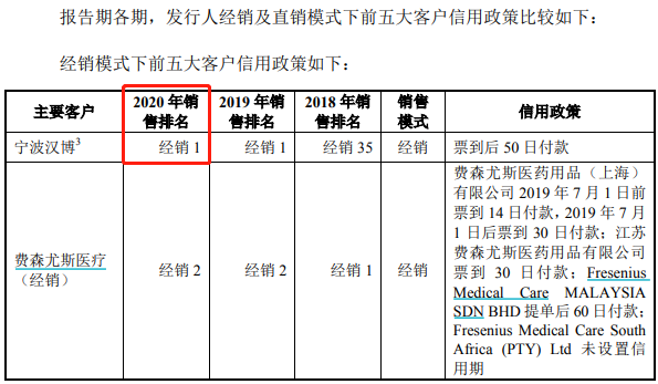 不仅如此,根据招股书披露,“宁波汉博国际贸易有限公司”原本是天益医疗重要经销商,招股书第123页披露,该经销商在2020年的经销金额排名第一,天益医疗通过该经销商向NeoMed、Synecco等终端客户进行销售。但与此同时,招股书页披露NeoMed于 2019年7月改为直接向天益医疗采购, Synecco也自2020年5月起与公司直接进行采购,原经由宁波汉博与公司开展的购销业务自此结束。在此背景下,“宁波汉博国际贸易有限公司”仍然被列为天益医疗2020年销售排名第一位的经销客户,并不符合正常逻辑。