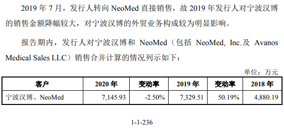 另据招股书第236页披露,天益医疗在2020年向宁波汉博、NeoMed合计销售7145.93万元,而招股书第234页则披露NeoMed作为第一大客户,在2020年向天益医疗采购了6998.95万元,这也就意味着天益医疗在2020年仍然通过宁波汉博向NeoMed间接销售了上百万元,这也与“eoMed于 2019年7月改为直接向发行人采购”的信息披露不符。