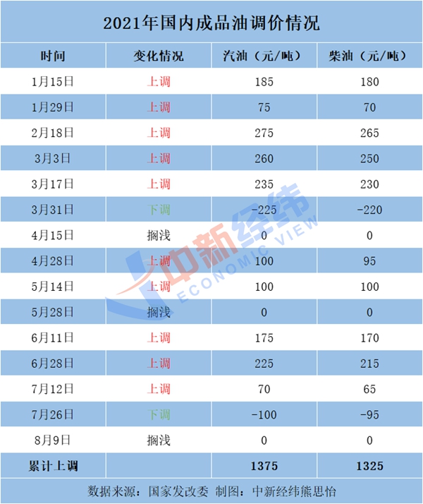 中新经纬客户端注意到,2021年以来国内成品油已进行15轮调价,汽油价格总计上调1375元/吨,柴油价格总计上调1325元/吨,呈现“十涨两跌三搁浅”的格局。如果本轮下调预期实现,将呈现“十涨三跌三搁浅”格局。