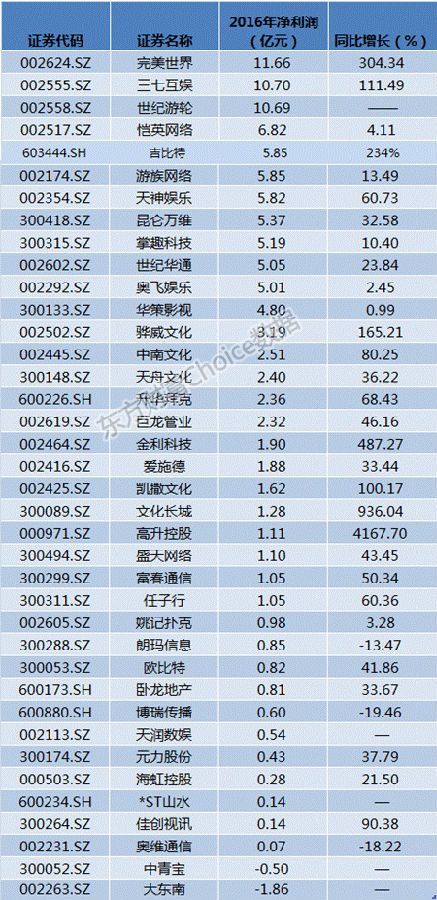 截至3月27日,东方财富Choice数据显示,在网络游戏题材板块的60家游戏公司中,已经有39家游戏公司发布了2016年年报,高营收、高业绩已经成为游戏公司的一大特色。多数A股上市游戏厂商业绩均表现不俗,完美世界、三七互娱、世纪游轮三家公司净利润超过10亿;吉比特、恺英网络、游族网络、天神娱乐、昆仑万维、掌趣科技等游戏公司净利润超过5亿元,26家游戏公司净利润过亿元。