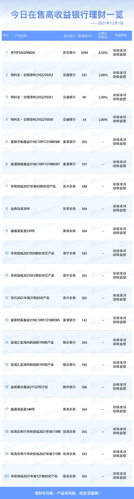 12月1日在售高收益银行理财产品