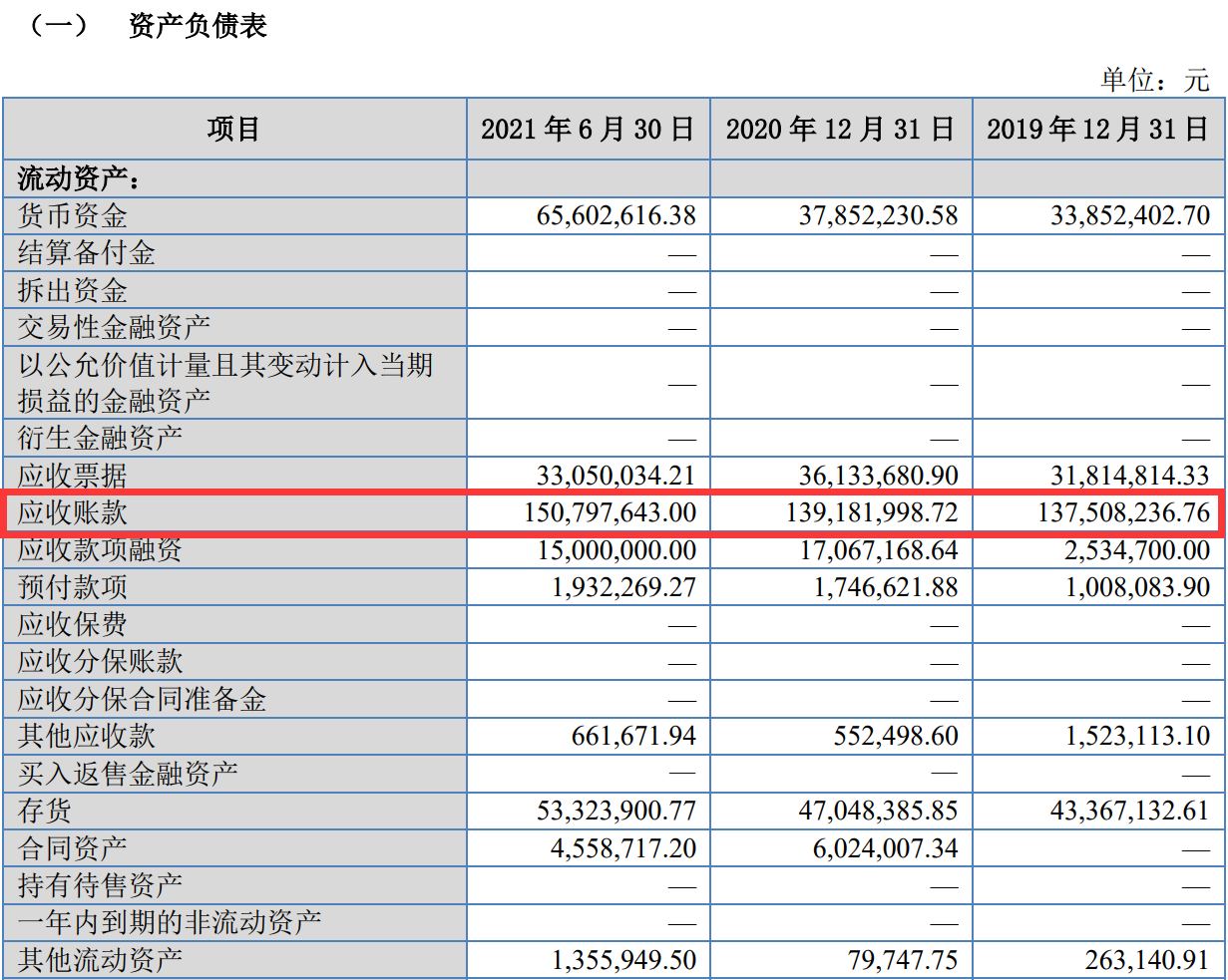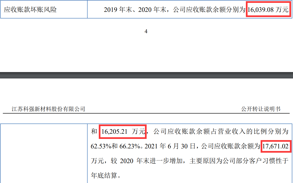 首先,在《公开转让说明书》“重大风险或事项”部分,科强股份披露,截至2019年末、2020年末、2021年上半年末,其应收账款余额分别为1.6亿元、1.62亿元和1.77亿元;而在“资产负债表”部分显示,在上述期间末,科强股份的应收账款分别为1.38亿元、1.39亿元和1.51亿元,即便再加上应收账款融资,与“重大风险或事项”部分披露的数据也不相符。