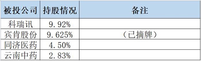 根据天眼查数据显示,信中利分别持股新三板上市公司科瑞讯9.92%股份、宾肯股份9.625%股份、同济医药4.5%股份以及云南中药2.83%股份。其中,宾肯股份已于2018年4月28日发布终止挂牌公告,公司摘牌。