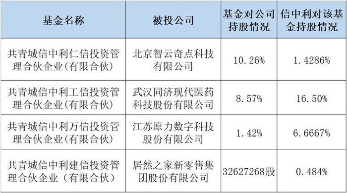 数据显示,共青城信中利仁信投资管理合伙企业(有限合伙)持股智云奇点10.26%股份,信中利对仁信基金持股1.4286%;共青城信中利工信投资管理合伙企业(有限合伙)持股同济医药8.57%股份,信中利对工信基金持股16.5%;共青城信中利万信投资管理合伙企业(有限合伙)持股原力数字1.42%股份,信中利对万信基金持股6.6667%;居然之家向共青城信中利建信投资管理合伙企业(有限合伙)发行股份32627268股,信中利对建信基金持股0.484%。