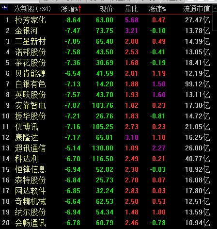 周二次新股板块整体跌幅超过2%,其中的安靠智电、花王股份和万集科技跌停;周三这种状况更是加剧,开盘后次新股板块一路下探,最低跌逾3%,次新股10余只个股跌幅超7%。并带动大盘一路走低。