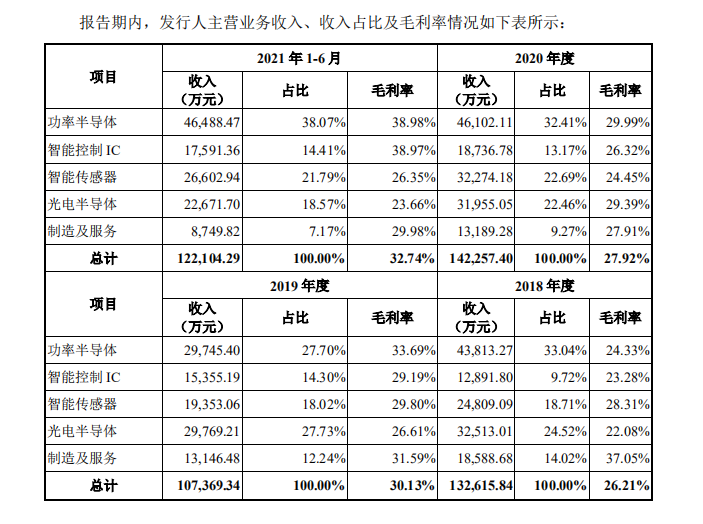 目前功率半导体是比亚迪半导体业务中的重要一环,其收入占比已达到38.07%,高于其他四项。2018年、2019年、2020年以及2021年1-6月,比亚迪半导体旗下功率半导体业务的营收分别为4.38亿元、2.97亿元、4.61亿元以及4.65亿元,占总营收比例分别为33.04%、27.7%、32.41%以及38.07%。