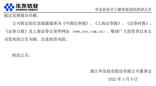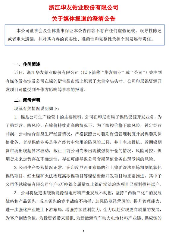 华友钴业3月9日晚间公告,近日关注到有媒体发布涉及公司在镍的衍生品市场上积累了大量空头头寸、公司印尼镍资源开发项目可能受到合作方影响等事项的报道。公司在印尼布局了镍钴资源开发业务,为了稳经营、防风险,在镍价持续走高的情况下,为了防控价格下跌风险,锁定经营利润,公司结合自身生产经营情况,严格按照公司套期保值管理制度开展镍套期保值业务。套期保值业务是生产经营中常用的防风险工具,并非主动投机。近期镍期货市场出现超异常波动,截至目前公司尚未出现被强制平仓的情况,风险可控。镍期货未来走势存在不确定性,存在可能导致公司套期保值业务出现亏损的风险。公司在印度尼西亚布局的红土镍矿湿法冶炼粗制氢氧化镍钴项目、红土镍矿火法冶炼高冰镍项目等镍钴资源开发项目均正常推进,其中子公司华越镍钴有限公司年产6万吨镍金属量红土镍矿湿法冶炼项目已顺利投料试产。