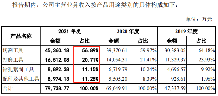 可以看到,开创电气所在的电动工具行业市场将逐步回暖。从主营业务来看,开创电气主营业务收入主要来源于切割工具、打磨工具和钻孔紧固工具和配件及其他工具。2021年,上述产品销售收入占主营业务收入的比例分别为56.89%、20.71%、11.15%和11.25%。