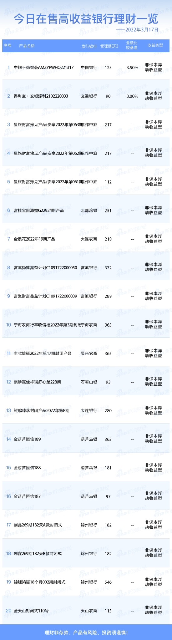3月17日在售高收益银行理财产品一览。今日业绩比较基准在3.00%及以上的银行人民币理财产品共2款。理财非存款、产品有风险、投资须谨慎!