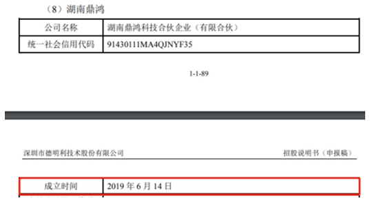 此外,德明利历史上经历了多次增资扩股。2019年6月10日德名利有限通过董事会决议,同意将公司注册资本增加至2209.9013万元,其中,湖南鼎鸿以2200万元认缴新注册资本22.6805万元,湖南瑞希以1500万元认缴新增注册资本15.4639万元。然而公开资料显示,湖南鼎鸿成立日期是2019年6月14日,而湖南瑞希成立日期是2019年6月20日,均晚于公司董事会决议通过上述两家公司增资的时点。