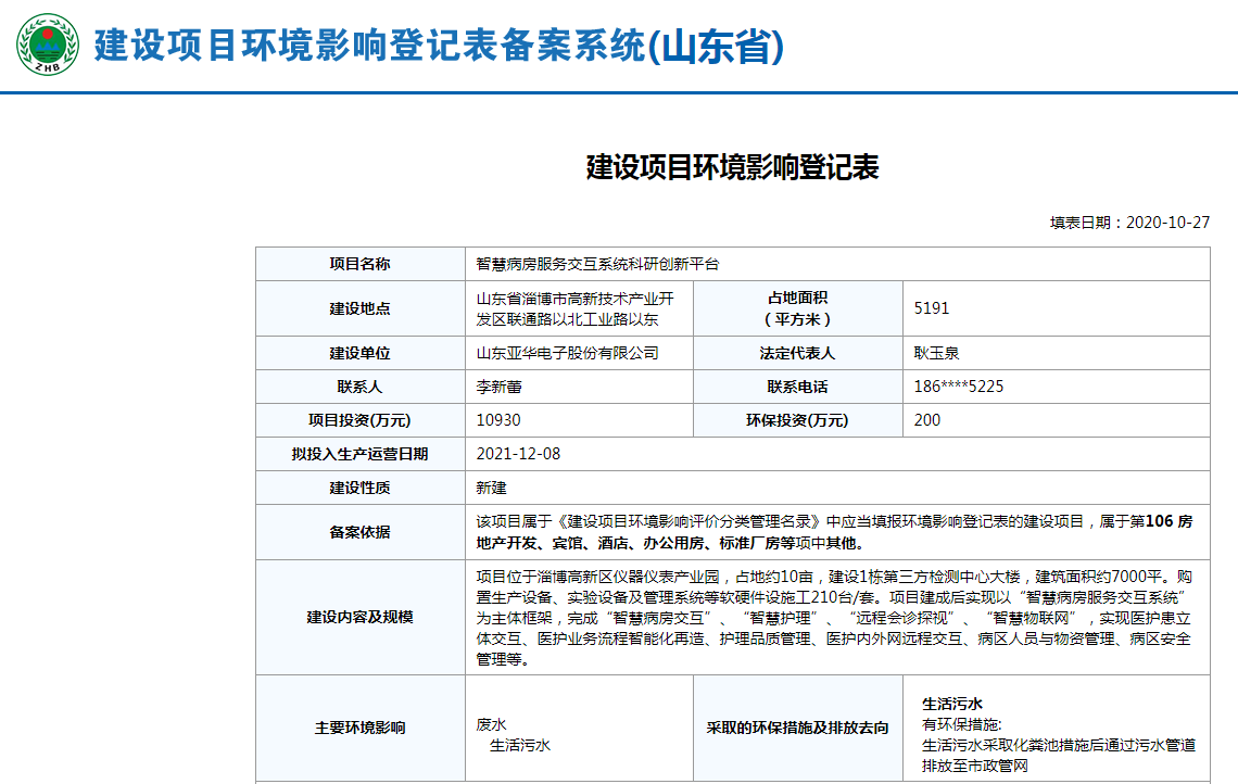 亚华电子招股书披露,公司此次上市募投的另一项目是投资,7,867.29万元用于研发中心建设。而在中华人民共和国生态环境部网站上,记者还发现,2020年10月,亚华电子对“智慧病房服务交互系统科研创新平台”项目进行环评备案。信息显示,上述项目总投资高达10930万元,项目位于淄博高新区仪器仪表产业园,占地约10亩,建设1栋第三方检测中心大楼,建筑面积约7000平。亚华电子称,项目建成后实现以“智慧病房服务交互系统”为主体框架,完成“智慧病房交互”、“智慧护理”、“远程会诊探视”、“智慧物联网”,实现医护患立体交互、医护业务流程智能化再造、护理品质管理、医护内外网远程交互、病区人员与物资管理、病区安全管理等。该项目2021年12月8日拟投入生产运营。