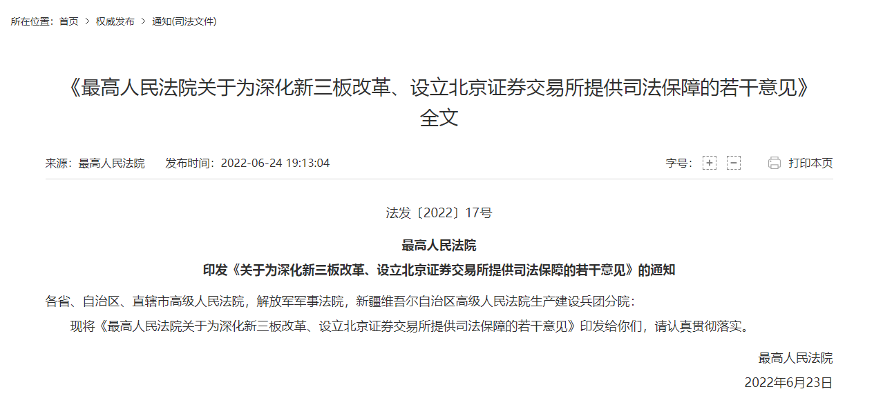 近日,为充分发挥法院审判职能作用,保障深化新三板改革、设立北京证券交易所顺利推进,最高人民法院发布了《关于为深化新三板改革、设立北京证券交易所提供司法保障的若干意见》(以下简称《保障意见》)。《保障意见》指出,法院要主动作为,以优质司法服务支持中小企业借助资本市场做大做强。