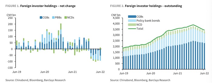 就外部需求来看,短期国际资金对中国债市的布局仍存不确定性,但整体净流出势头从7月开始大概率将缓和。巴克莱外汇、宏观策略师张蒙告诉记者,6月,外资对人民币债券的持有量连续5个月下降,但与3月创纪录的资金流出速度相比有所放缓。继5月下降977亿元之后,6月下降了861亿元。这种平仓行为似乎在7月停止,持仓量再次攀升,买入的标的主要集中在短期国债上,预计7月整体可能会有50亿美元的资金流入。