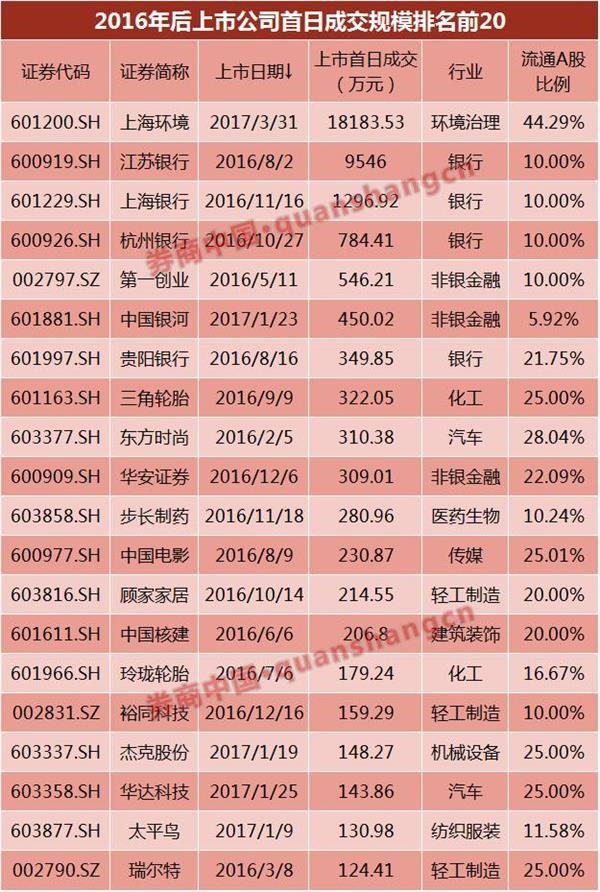 梳理2016年以来上市新股首日成交额发现,交易额前三的都是银行股,分别是江苏银行、上海银行、杭州银行,成交额分别是9546万元、1296.92万元、784.41万元。