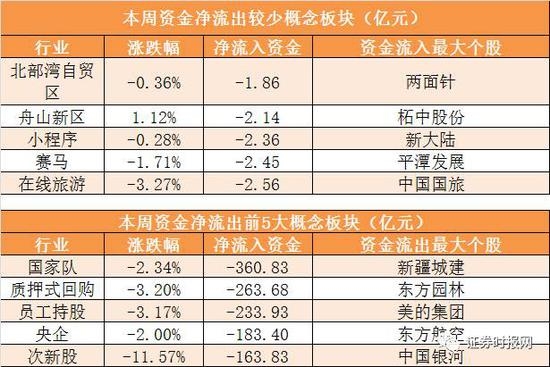 概念板块方面,本周无一概念板块资金实现净流入。北部湾自贸区、舟山新区、小程序等概念板块资金净流出相对较少。