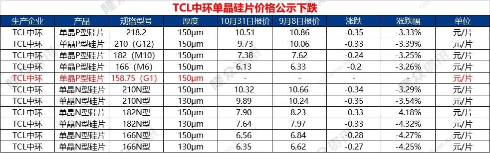 TCL中环最新报价显示,150μm厚度P型218、210、182、166硅片报价分别为10.51元/片、9.73元/片、7.38元/片、6.13元/片,较9月8日上一轮报价分别下调0.35元/片、0.33元/片、0.24元/片和0.2元/片,降幅在3.1%~3.2%。
