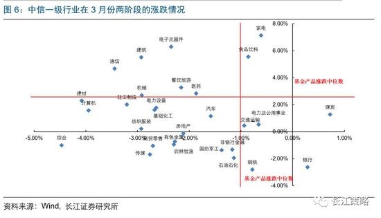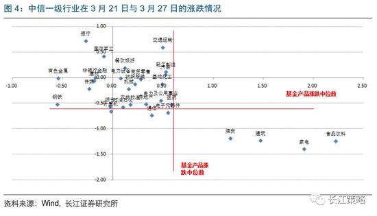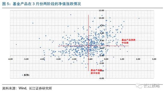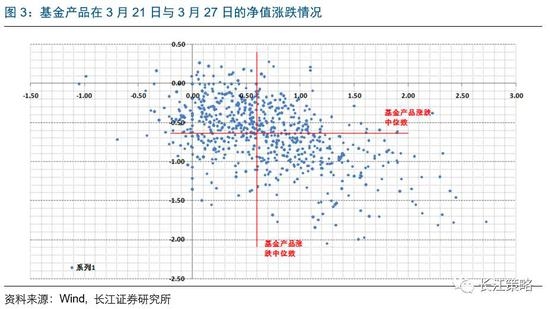 为了更严谨地看配置集中度较高的问题,我们再选取两段时间窗口,如下图所示,横轴表示3月27日~3月31日各基金净值涨跌,纵轴表示3月1日至3月26日各基金净值涨跌。
