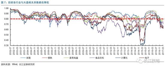 上周周报中,我们回溯了近15年各申万行业与大盘的相关系数,从过去的数据可以看到,基本上各个阶段都有部分行业的相关系数处于0.85以上高位。但当前的时点,有些不一样的变化:我们看到几乎所有板块与沪深300的相关系数一起大幅下滑到了0.75左右的位置。充分说明行业加速分化,大部分行业轮动速度加快的特点。