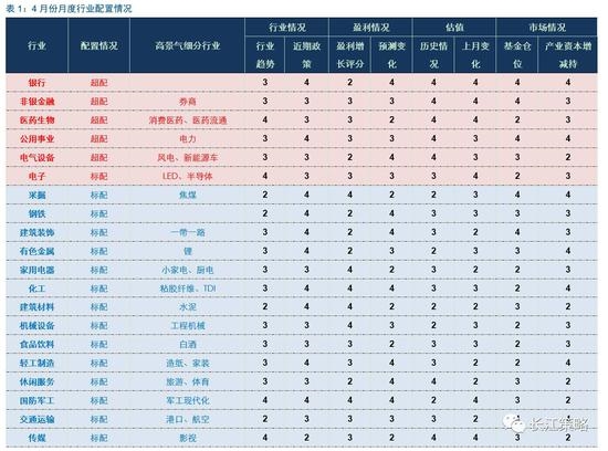 整体来看,我们认为四月份行业配置应以防御为主,首选估值相对较低的大金融板块,其次选取各个板块中业绩确定性高,同时估值相对有吸引力的行业。推荐关注银行、非银、医药、电气设备、电力等行业。