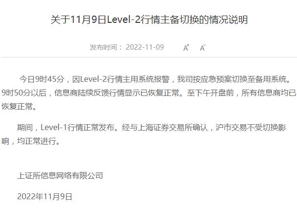 上证所信息公司:因Level-2行情主用系统报警 按应急预案切换至备用系统