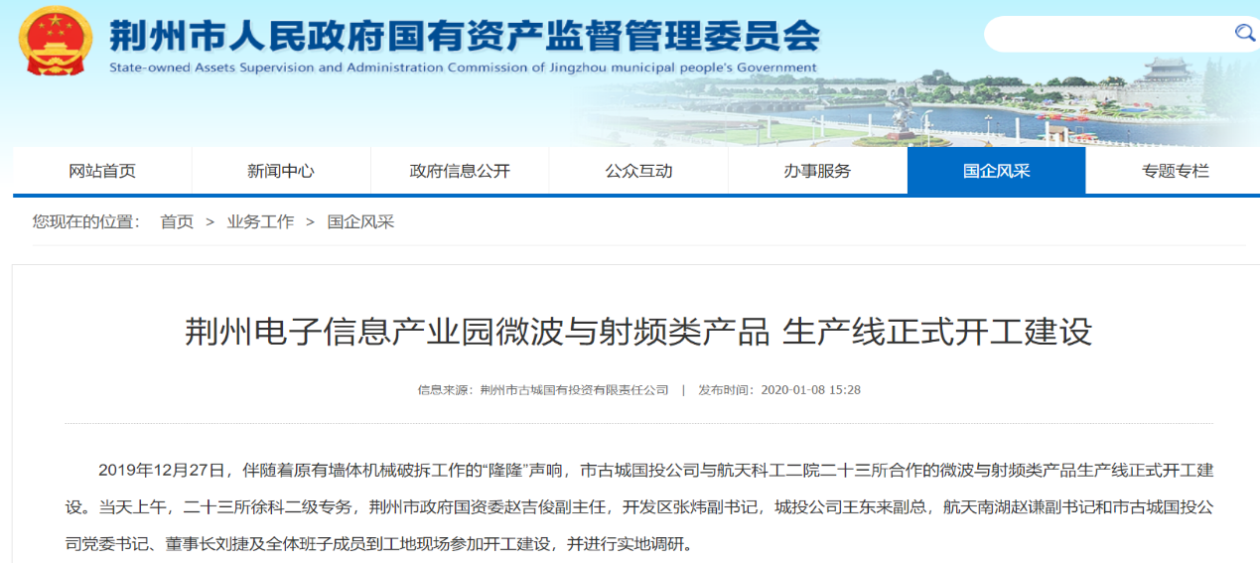 荆州国资委此前于2020年1月发布的《荆州电子信息产业园微波与射频类产品生产线正式开工建设》报道,其中提到“2019年12月27日,伴随着原有墙体机械破拆工作的”隆隆“声响,市古城国投公司与航天科工二院二十三所合作的微波与射频类产品生产线正式开工建设”。但如前述公开信息,针对“荆州电子信息产业园(一期)保障条件建设项目施工总承包”项目,天航南湖在2022年9月才发布了中标公告,这相比荆州国资委发布的该项目正式开工建设已经晚了近两年时间。