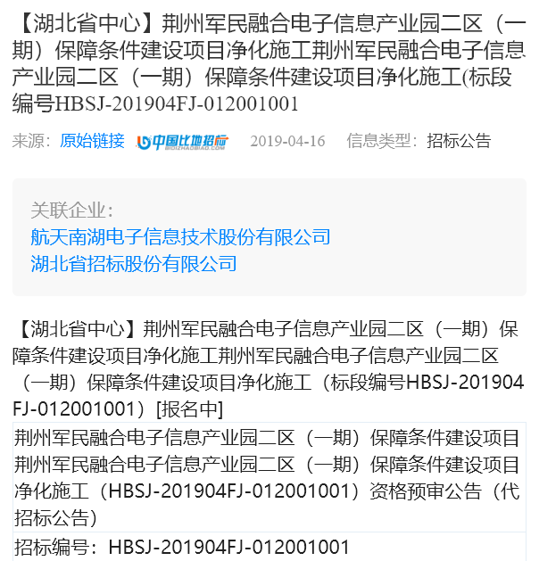 另据公开信息显示,航天南湖还曾于2019年4月发布过《荆州军民融合电子信息产业园二区(一期)保障条件建设项目净化施工荆州军民融合电子信息产业园二区(一期)保障条件建设项目净化施工》的招标(标段编号HBSJ-201904FJ-012001001),合同估算价高达5000万元。