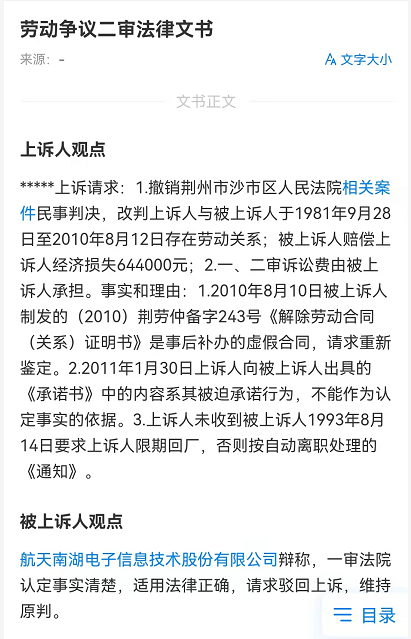 根据《天眼查》显示,航天南湖前员工曾因劳动纠纷对公司提起诉讼,该员工指称“2010年8月10日被上诉人制发的(2010)荆劳仲备字243号《解除劳动合同(关系)证明书》是事后补办的虚假合同”,索赔金额高达64.4万元。针对该案,审理法院在文书中也提及:“南机厂解除劳动合同关系的《通知》未向原告送达”,这令人担忧航天南湖在员工劳动关系管理中存在经营风险。