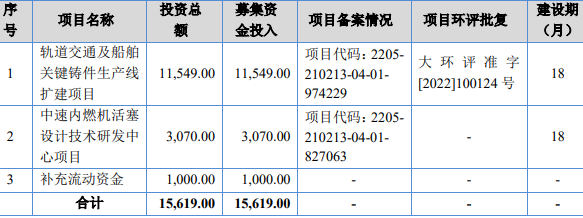 汇隆活塞拟募集资金1.56亿元,分别用于轨道交通及船舶关键铸件生产线扩建项目、中速内燃机活塞设计技术研发中心项目、补充流动资金。