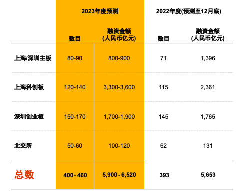 普华永道中国审计合伙人陈建孝表示:“2022年A股IPO融资额位居全球股市之首,得益于中国经济的韧性、众多科技企业的脱颖而出、以及鼓励已在境外上市的大型红筹公司回归A股。随着更多刺激经济措施的推行落实,及宏观政策对提升企业直接融资的推动,普华永道预计2023全年A股市场IPO数量将达400-460家,全年融资额有望再创新高,达到5900-6520亿元人民币。”