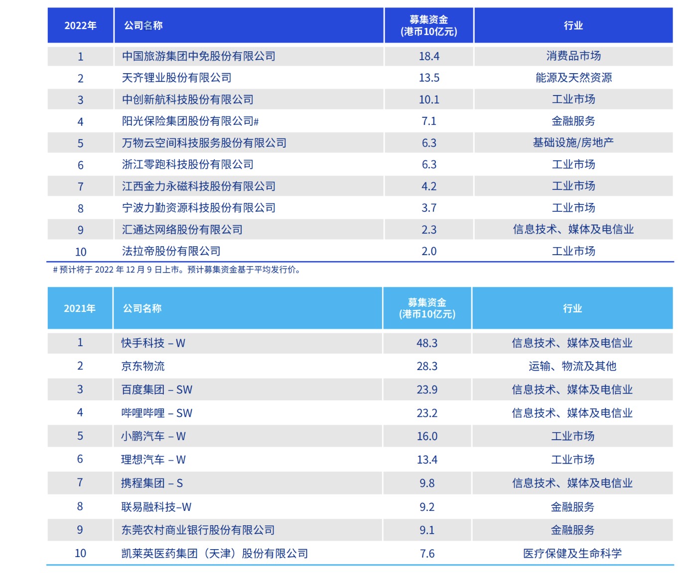 再和2021年比较,今年前十大IPO的募资量亦是大幅下滑。根据会计咨询机构毕马威的数据,2022年前十大IPO募资额仅有739亿港元,2021年有1888亿港元,同比跌幅超过6成。