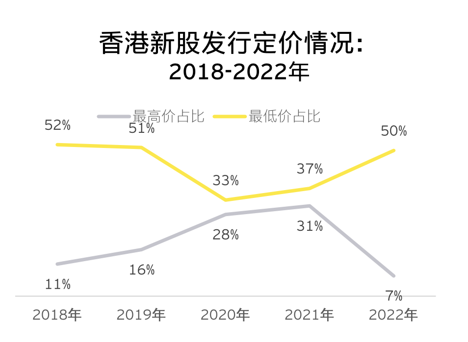 招股价方面,有超5成IPO以下限定价或低于招股价定价,仅有7%的新股以最高价发行,与去年相比,行情更为低迷。